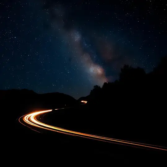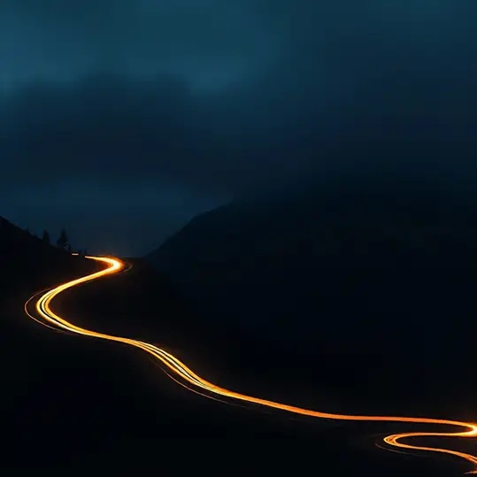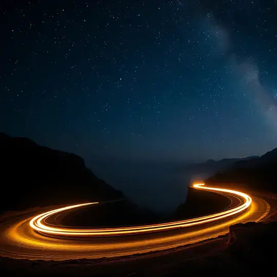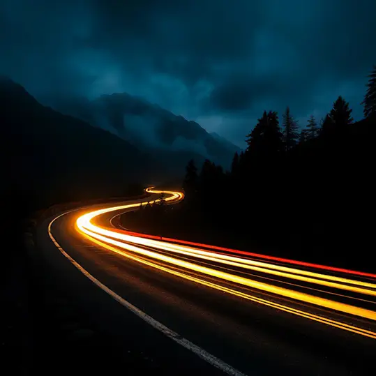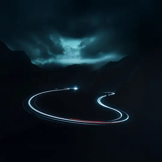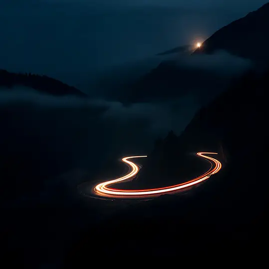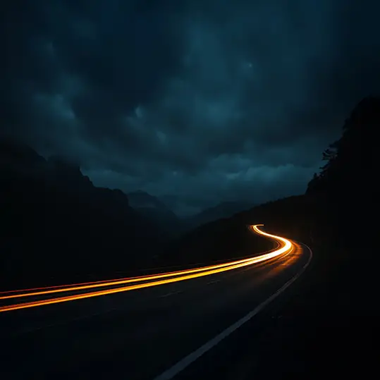 تاریکی، نماد ناشناخته‌ها و ترس‌هاست، اما همچنین فضایی است برای تفکر و تأمل. در این فضا، ما می‌توانیم به عمق وجود خود سفر کنیم و با احساسات و افکار پنهان‌مان روبرو شویم.هر عکس، داستانی از حرکت و زندگی را روایت می‌کند؛ داستانی از سفرهایی که در دل کوه‌ها و در میان پیچ و خم‌های خطرناک و زیبا شکل می‌گیرد.نورهای درخشان ماشین‌ها، همچون ستاره‌هایی در آسمان شب، جاده را روشن می‌کنند و به ما یادآوری می‌کنند که در هر سفر، چه در دنیای واقعی و چه در دنیای درون، همیشه نوری وجود دارد که ما را به جلو هدایت می‌کند.